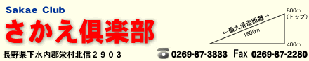 ↑ゲレンデボトム、ファミリーで楽しめる そりゲレンデ。  |  ↑初級者が楽しめる、スキー場中腹の 林間迂回コース。 |  | | ●シーズン ●斜面構成 上級20%・中級60%・初級20% ●コース 9コース ●最長滑走距離 1,500m ●最大斜度 34度 ●リフト運行時間 平日:8:45~16:00 土日祝日:8:30~16:00 ※12月29日~1月3日は土日祝営業時間となります ●早朝スキー -- ●ナイター -- ●入場料 1日券 大人4,500円 詳しくはこちら ●スノーボード 全面滑走可 ●スクール SAJ公認 さかえ倶楽部スキースクール ※営業は土日祝日、年末年始 ●託児施設 -- ●スノーマシン -- ●その他 休憩室○ 無料更衣室○ 温泉○(中条温泉・トマトの国)、プール× キッズゲレンデ○ モーグルバーン× クロスカントリー× ヘリスキー× スノーモービル× ●駐車場 230台(無料) ●アクセス 【車】関越自動車道塩沢・石打ICから42km 約55分 【電車】飯山線森宮野原駅よりシャトルバス5分 (公共交通機関の使用に限ります。要予約) ●問い合わせ さかえ倶楽部スキー場 0269-87-3355 |
