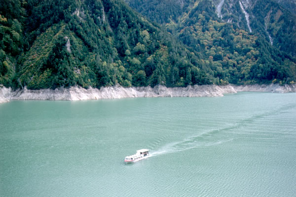 ![]() 遊覧船「ガルベ」 目の前に迫る北アルプスの大自然を気軽に満喫できる遊覧船。1周約30分、料金大人930円、小人470円。(運航期間:6月1日〜11月10日まで) |