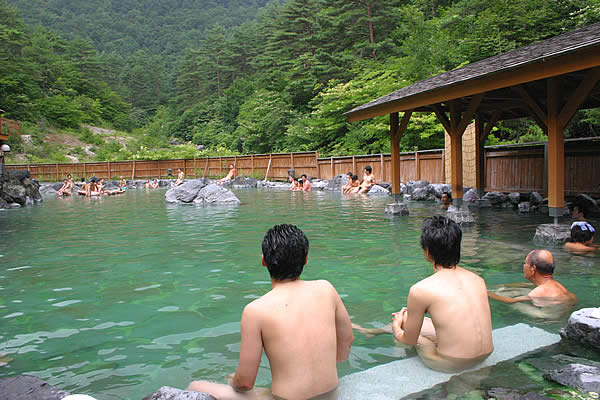 園内にある草津一の大露天風呂。気軽に入浴できます。