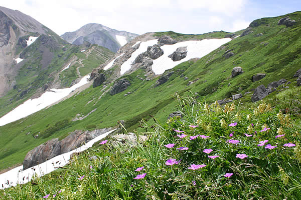 ハクサンイチゲ、シナノキンバイ、ミヤマキンバイ、トリカブト、クルマユリ、ミヤマキンポウゲ、シロウマアサツキ、オオハナウド、ハクサンチドリ、ヨツバイオガマetc