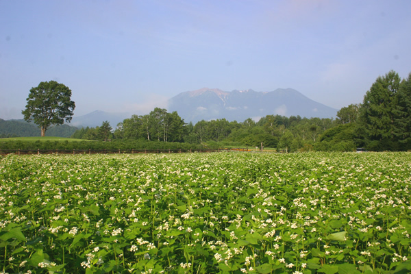 ソバの花 (6月中旬〜7月上旬 8月下旬〜9月中旬 開田高原) 開田高原は「霧下そば」の特産地。小ぶりな花がソバ畑一面を純白に染めあげ、周囲の緑や御岳山の雄姿と美しいコントラストをなす。(写真は木曽馬の里にて) 問/開田高原観光案内所 ・0264-42-3350