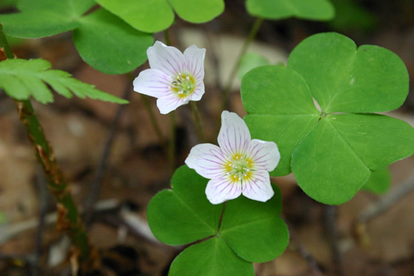 ピンクがかった白い小さな花を咲かせる。まれに赤や紫の花も見られることがある。葉は、中央に線の入ったハート型の三枚の葉よりなる。 |