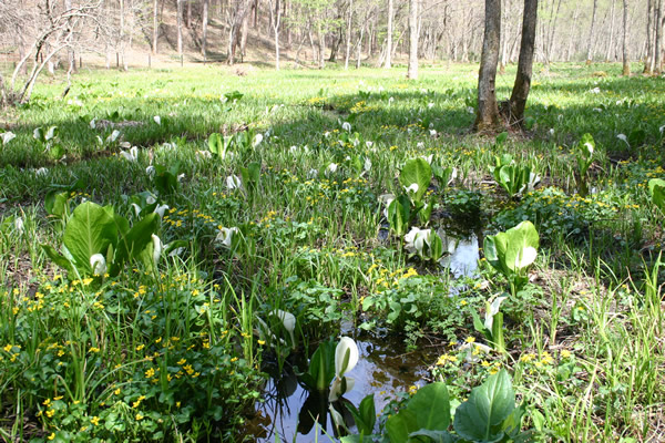 ミズバショウ (安曇野大町・居谷里湿原 4月下旬〜5月上旬) 長野県天然記念物指定の居谷里湿原。4月よりザゼンソウ、リュウキンカ、ミズバショウと徐々に時を移しながら咲いていき、5月上旬には真っ赤に映えたハナノキ、そしてミツガシワが純白に湿原を染めます。