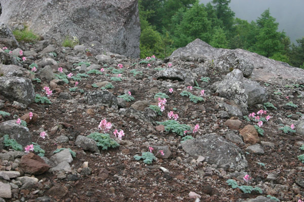 コマクサの群生 (池の平湿原 見晴岳、三方ヶ峰 6月下旬〜7月中旬) ※かつて盗掘が多かったため、現在金網で保護されているが、撮影はできます。