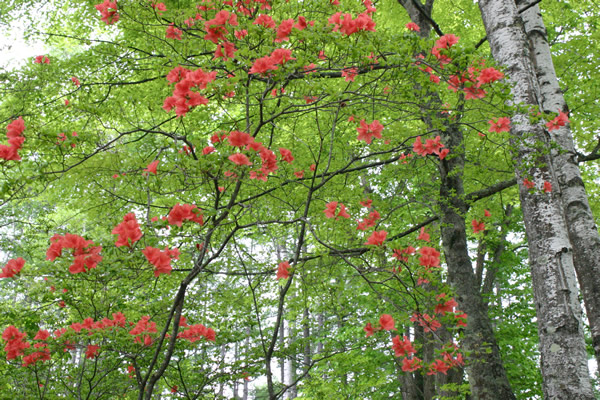 新緑とヤマツツジ (八ヶ岳山麓・八千穂高原 5月中旬〜6月上旬) 新緑の高原を鮮やかな朱色で彩る、日本を代表するツツジの一種。レンゲツツジによく似ているが、 ヤマツツジはレンゲツツジより先に開花、レンゲツツジよりやや小ぶりで色が濃い。 ヤマツツジの花びらは丸く、レンゲツツジは先が尖っている。八千穂高原で群生している。