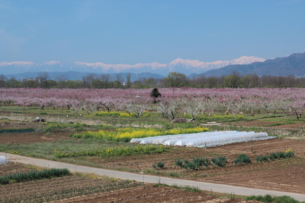 約8000本の桃の木に鮮やかなピンクの花が咲き揃います。遠く残雪の北アルプス、