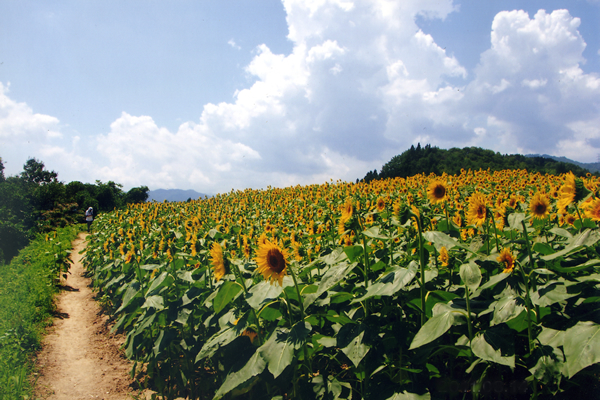 平石農場ひまわり畑 (長野県下伊那郡阿南町 8月上旬〜下旬) 農業実践グループ「野良舞夏ひまわり倶楽部」が運営する農場。 毎年お盆のころ、南北500メートル東西200メートル、 1.3ヘクタールの農場に15万本ものひまわりが一面に咲き誇ります。