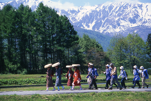 塩の道祭りは、例年ゴールデンウィークの連休に、北は小谷村から白馬村を経由して、南は大町市までを結んで行われる、春の北アルプス山麓の一大イベント。往時を偲んで昔の旅姿でウォーキングを楽しんだり、北アルプス山麓の写真を撮ったりと、楽しみ方は色々。地元住民からの歩荷(ぼっか)汁、漬物等の振舞いや記念品のプレゼントなど、催しも盛りだくさん。