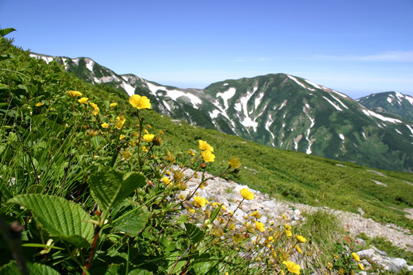 白馬大池から小蓮華山を経て白馬岳に至る縦走路は、山岳パノラマと高山植物の人気のルート。白馬大池から船越の頭を経て小蓮華山へ続く登りは雷鳥坂と呼ばれ、文字通り雷鳥の生息地。西側に雪倉岳と朝日岳のパノラマを見ながら、チシマギキョウやミヤマダイコンソウ、ハクサンイチゲ、コマクサなどの高山植物が咲き誇る快適な稜線の登山道を行きます。小蓮華山にたどり着くと、三国境の向こうに白馬岳や杓子岳の雄姿が。小蓮華山を過ぎると新潟・富山・長野の境となる三国境に至り、ここから約1時間で北アルプスの名山白馬岳山頂にたどり着きます。白馬大池より約3時間45分の行程。