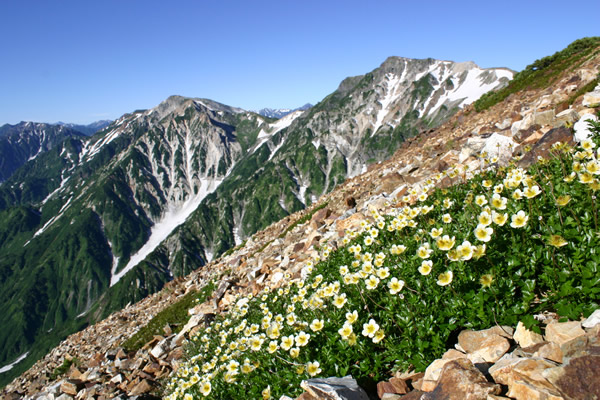 小蓮華山手前より、白馬岳(右)杓子岳(左)の雄姿と、ハクサンイチゲ、シナノキンバイのお花畑。