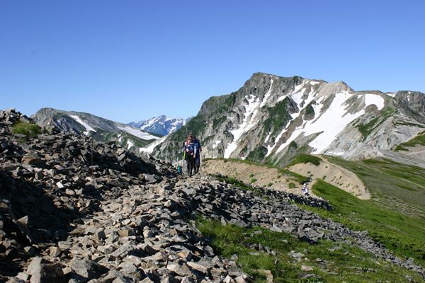 白馬岳から小蓮華山を経て白馬大池に至る縦走路は、山岳パノラマと高山植物の人気のルート。小蓮華山から船越の頭を経て白馬大池へと下るルートは雷鳥坂と呼ばれ、文字通り雷鳥の生息地。西側に雪倉岳と朝日岳のパノラマを見ながら、チシマギキョウやミヤマダイコンソウ、ハクサンイチゲ、コマクサなどの高山植物が咲き誇る、快適な稜線を往く縦走路。アルプスの宝石と呼ばれる白馬大池にたどり着けば、池畔にはチングルマやハクサンコザクラの大群落が(7月〜8月上旬)。白馬乗鞍岳からは、天狗原を経て栂池自然園までの下り。白馬岳より栂池自然園まで約6時間の行程。