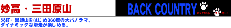 妙高三田原山は、長野・新潟県境にそびえ立つ妙高山の西側を三日月型の円で取り巻くように横たわる外輪山。妙高高原町杉野沢から妙高小谷林道を車で笹ケ峰国民休暇村と杉ノ沢との中程にある地点池ノ峰に向かい、三田原山を目指してスタート。標高1310mの池ノ峰第一パーキングから三田原山山頂2300mまで高度差約1000m直登にアタックする。この三田原山山岳行には定まったルートがない。雪を被った雑木林の中、左手に雪の池ノ峰を見ながらなだらかな裾野で足ならし500m程歩いてから、斜面にアプローチ、後は山頂を目指して黙々と歩を進めていく。ダケカンバなどの低木が目立ち始める標高2000mエリアで斜度が35度〜40度と一気にきつくなる。この斜面を踏破するとそこが山頂、360度の山岳パノラマ、ダイナミックに展開する自然の中、すり鉢状の火口の中からひょっこり顔をのぞかせる妙高の本山を取り囲むように三田原山の山頂尾根が雪山のチャレンジャーたちを歓迎し白く輝いている。