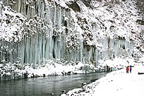 白川氷柱群(木曽町三岳、西野川) 御岳山の湧水が凍り、幅250m、高さ最大50mの大氷柱群が姿を現す。夜間にはライトアップも。