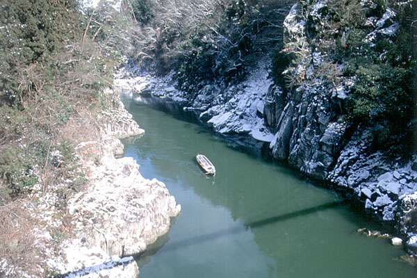 南信州伊那谷観光のハイライト「天竜川舟下り」は、豪快水しぶきの中の遊覧。一本の竿で進むスリリングな約10kmの舟旅。年間運行、冬のこたつ船も人気だ。