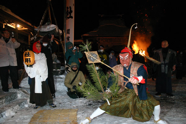 長野県の最南端に位置する阿南町に、古くより続く伝統行事。雪を稲穂の花にみたて、大雪(=豊年)を願う祭りで、伊豆神社境内でとりおこなわれます。