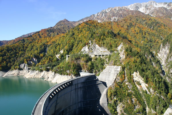 信州側からは、大町アルペンラインで扇沢へ。ここまではマイカーもOK、バスは40分の道のりだ。マイカーは扇沢駅駐車場に置くか、富山側への回送システムを利用。扇沢駅から標高2678mの赤沢岳を貫くトンネルはトロリーバスで黒部ダム駅まで16分。高さ186m、堤492m、総貯水量2億t。日本最大のアーチ式ドーム型の黒部ダムは、立山連峰と張り合う堂々のモニュメントだ。ダム駅屋上には展望台。青空をバックに悠然と聳える峰々、眼下に満々とエメラルドグリーンの水をたたえたダム湖。湖上巡りの遊覧船体験も爽やかさを加速する。