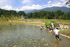 ![]() アルプスの清流を集めた人工池。ファミリーでメダカやオタマジャクシ採りを楽しむことが出来る。 |