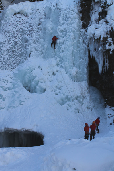 落差21.5m、幅8mの氷瀑は迫力満点、クライマーにも人気で、アイスクライミングを楽しむ人々も。