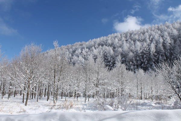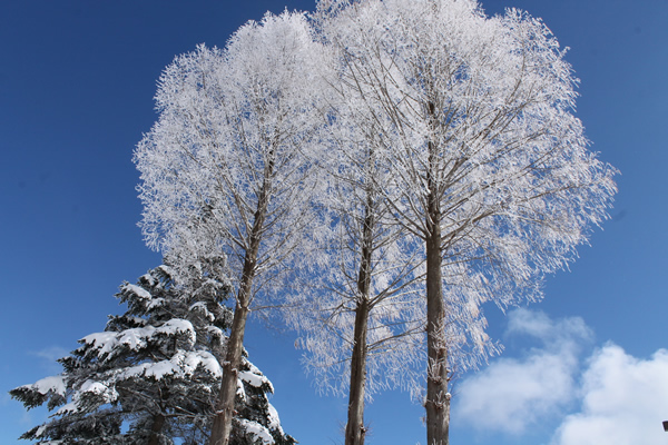 降雪の後の晴れた日の朝には、樹氷の幻想的な風景が広がります。