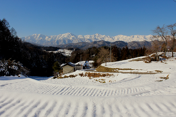 村の高台の立屋地区からは、雪をいただいた北アルプスが紺碧の空にくっきりと稜線を描き、