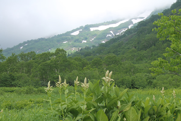 北アルプスとミズバショウの群生 (6月中旬〜下旬)