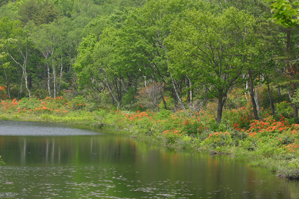 レンゲツツジ (6月上旬〜下旬)  国立公園として豊かな植生を保全している志賀高原には高山植物が豊富だ。明るい紅色で初夏の高原を彩るレンゲツツジは、一沼(写真)や蓮池、田ノ原湿原、木戸池などで鑑賞することができる。