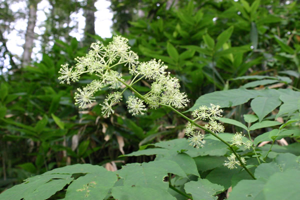 深く裂けた根生葉を持つ。茎に3枚が輪生する葉には、サンリンソウのような柄はない。5月に、白い萼片を持つ花をつける。森林植物園内の至るところで群生している。