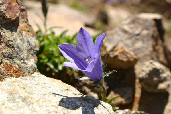 チシマギキョウと雪倉岳 (雷鳥坂 7・8月) 花の色は青紫色、大きさは4cmほどで縁に白い毛が生えている。よく似た種にイワギキョウがあるが、萼片が三角形をしている点などから区別できる。