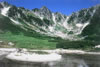 白馬大雪渓 真夏でも冷風が吹き抜ける白馬大雪渓 高山の短い夏を歌う花たちが鮮やかに彩る |