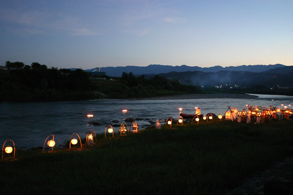 天竜川舟下りの時又港で開催される、南信州飯田地方で最大規模の花火大会と灯ろう流し。夜空を彩る花火が打ち上げられるなか、読経に合わせ御霊を乗せた灯篭が天竜川の川面を照らし下ります。