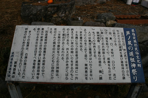 長野市大岡芦ノ尻地区に伝わる道祖神祭り。毎年1月7日に家々から持ち寄った松飾りや注連縄(しめなわ)で、道祖神と書かれた石碑に神面飾りをし、集落に悪霊が入り込まないように、また家内安全、五穀豊穣、商売繁盛、縁結び、厄除け等々の祈願をします。この日は、1年間の守護役をつとめた神面を石碑からはずし、どんど焼きの炎とともに自然に還します。1998年の長野冬期オリンピックの開会式では、この奇抜な面立ちの道祖神の入場が紹介され、世界中の注目を浴びました。