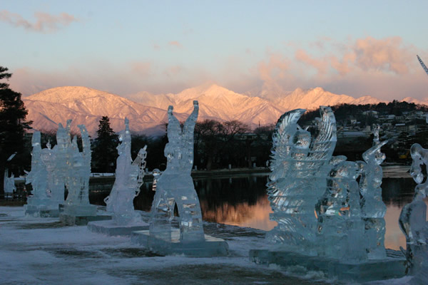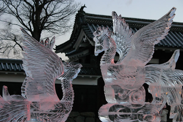 国宝松本城を背景に開催される、松本市毎年冬恒例の氷彫イベント。全国氷彫コンクールや氷のジャンボ滑り台、キャラクターショーなど、冬ならではの氷の祭典を楽しめます。入場無料。