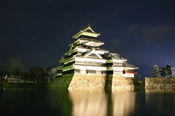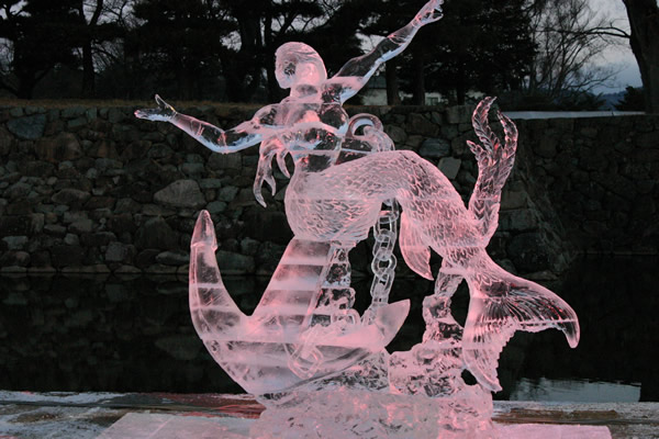 ライトアップされた氷彫と 国宝松本城(早朝6:00〜)