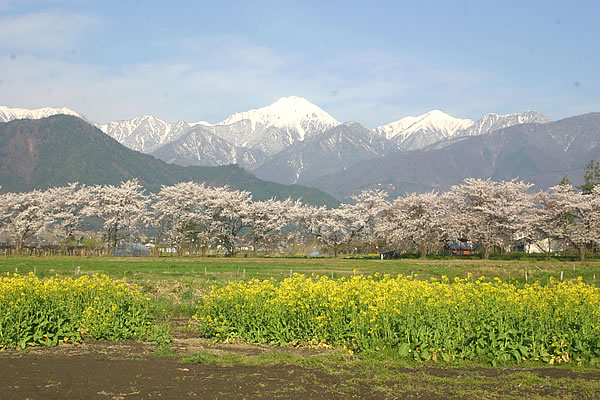 北アルプス常念岳は安曇野の象徴的な山。その残雪の常念岳を背景に、のどかな安曇野の堤に沿いに植えられた桜が素晴らしい風景を創りだしています。 【お知らせ】 平成22年11月に、桜を元気にするために、またこの先も永く桜を楽しめるようにと、枝払いが行なわれました。 そのため、2011年の春には桜の景色をみることはできませんが、4・5年後には再びたくさんの花をつけるそうです。 皆様には、ご迷惑をおかけしますが何卒ご理解とご協力をお願い申しあげます。(安曇野市HPより)