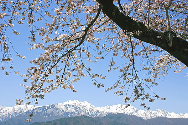 北アルプスの玄関口、立山黒部アルペンルートの信州側基点でもある大町市。市の郊外の高台にある大町公園、大町観光道路周辺は、桜の向こうに北アルプスの大パノラマが広がる桜の名所。残雪の爺ヶ岳、鹿島槍ヶ岳、五竜岳などの北アルプスと、桜の美しいコントラストがなんともいえません。