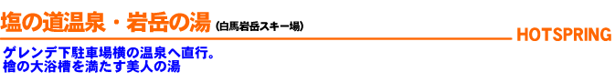 | ゲレンデ直下の駐車場と隣り合わせた岩岳の湯。アフターはとにかく温泉! という人にはうってつけ。ヒノキが香るワイドな浴槽に2500万年前の海水が還流した太古の湯があふれ、開放的な気分でリフレッシュできる。肌がツルツルになる美肌の湯としても人気。 |